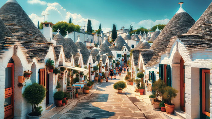 Alberobello é uma cidadezinha charmosa no sul da Itália, famosa por suas casinhas brancas de pedra com telhados cônicos, chamadas trulli. Parece cenário de conto de fadas e é Patrimônio da Humanidade pela UNESCO. Ideal pra se perder pelas ruelas e tirar fotos lindas!