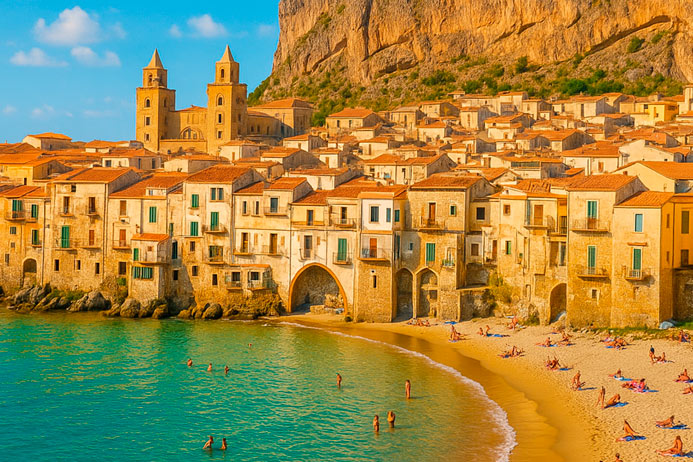 Cefalù é aquele vilarejo siciliano que parece ter saído de um cartão-postal. Tem uma praia linda com mar cristalino, casinhas coladas na encosta e um centrinho histórico com ruas de pedra e uma catedral imponente. A gente estaciona o motorhome, caminha até a areia e termina o dia com um granita de frente pro pôr do sol. É simples, acolhedora e absolutamente encantadora — impossível não se apaixonar!